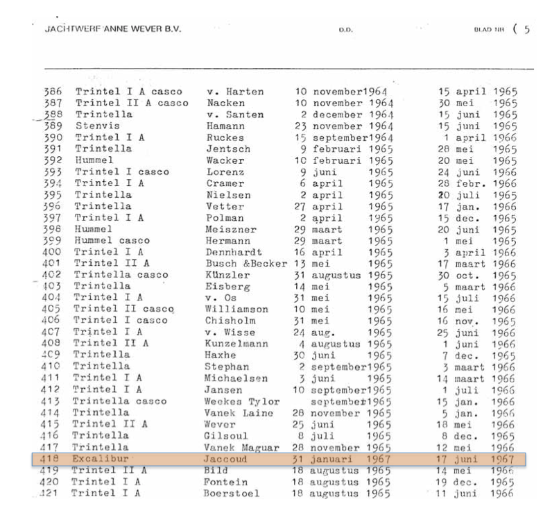 Moulded by the Tyler Boat Co, the GRP design proved to be immensely strong. Most Excaliburs were completed by Southern Ocean Supplies in Bournemouth, later renamed to Southern Ocean Shipyard, some by Van de Stadt in Zaandam, Holland and at least one has been completed by Anne Wever in ‘s-Hertogenbosch, Holland. At the end of her production run in 1970, the Excalibur SK was available with a cutaway keel and a skeg rudder instead of the original spade rudder. In all, 52 boats were built.